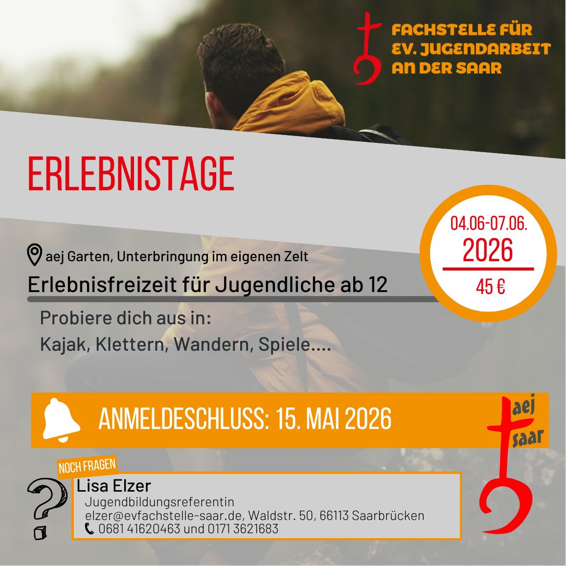 In den Erlebnistagen vom 4-7.Juni 2026 ab 12 Jahren zelten wir in unserem aej Garten in St.Arnual, wo wir auch gemeinsam outdoor kochen. Außerdem erwartet euch Kajak fahren, Klettern, kooperative Spiele, Gemeinschaft uvm.
